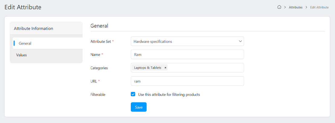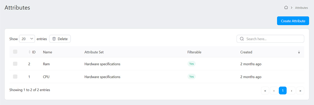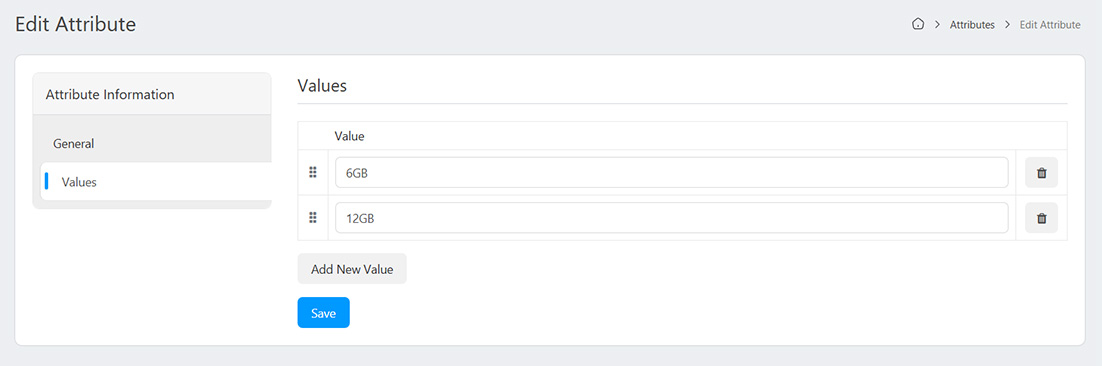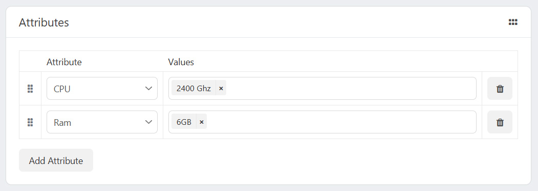 In order to add attributes you must first create an attribute from the Attributes menu. Attributes can be used for filtering products and showing additional information about the product in a tabular form.