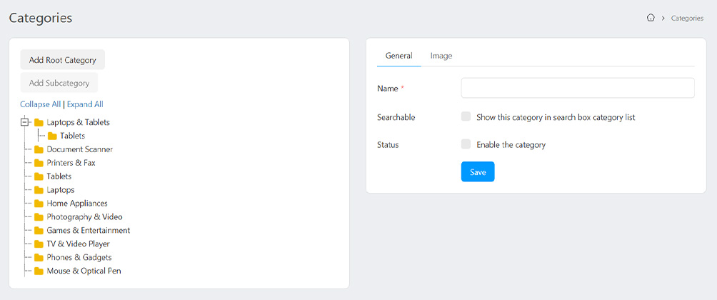 You can create, edit and see a tree of categories from the Categories sub-menu.