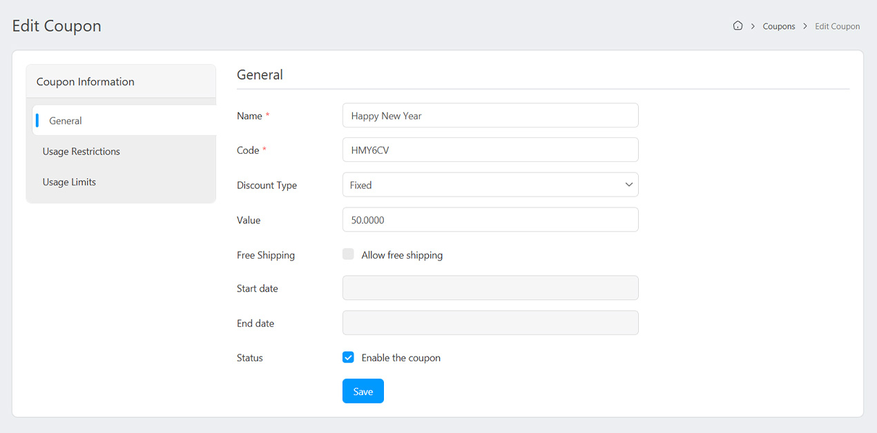- Rate: The percentage tax rate will be calculated based on the subtotal of the shopping cart