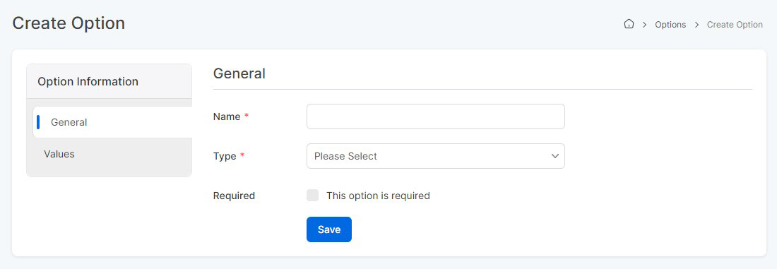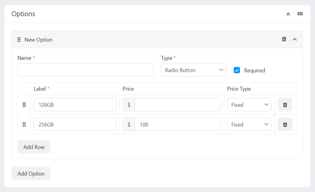 Options provide an easy way to offer product variations, such as sizes, colors, or materials, etc. Options enhance the shopping experience by allowing customers to customize their selections. You can select the option type, such as dropdown, radio, or custom radio button, etc to determine how you would like to represent the product option.