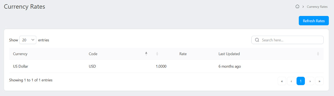 You can use third-party service like Fixer, 1Forge, or Currency Data Feed to refresh currency rates. Click on the Refresh Rates button to refresh currency rates. If a third-party service is not configured, configure it from Settings > Currency.