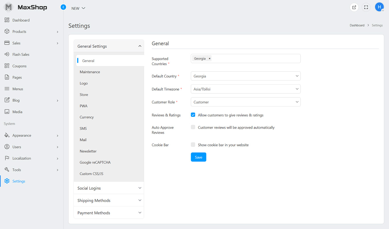 - Default Country: The default country of your store.