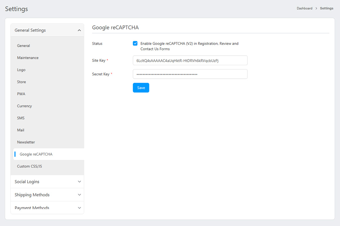 Enable Google reCAPTCHA for Registration, Review, and Contact Us forms to enhance website security against automated submissions. Activate this feature with a toggle and enter the provided "Site Key" and "Secret Key" for integration. This helps verify human users and prevents spam effectively.