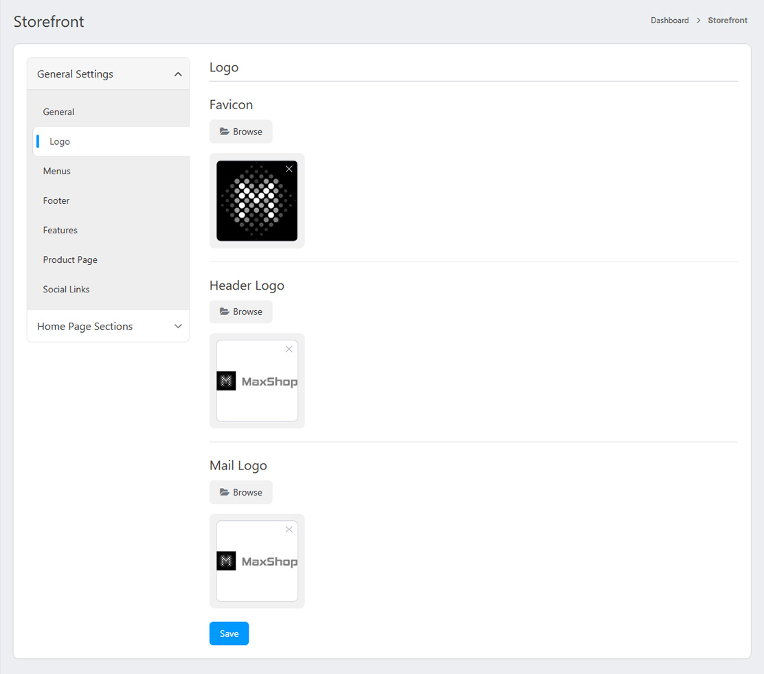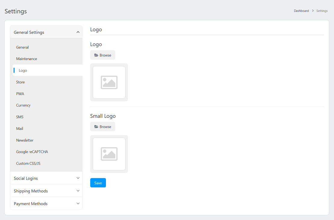 This section allows you to set two types of logos for your website: a standard logo and a small logo.