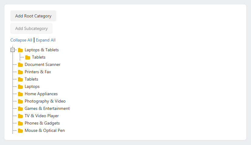 In order to create a subcategory select a category, then click on the Add Subcategory button. After saving the subcategory you'll see a nested category under the root category.