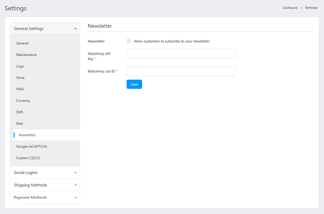 Within the Newsletter settings, customize how customers engage with updates. Enable customer subscriptions to your newsletter for smooth communication. Integrate Mailchimp using the API Key to automate subscriber management and specify the List ID for organizing new subscribers.