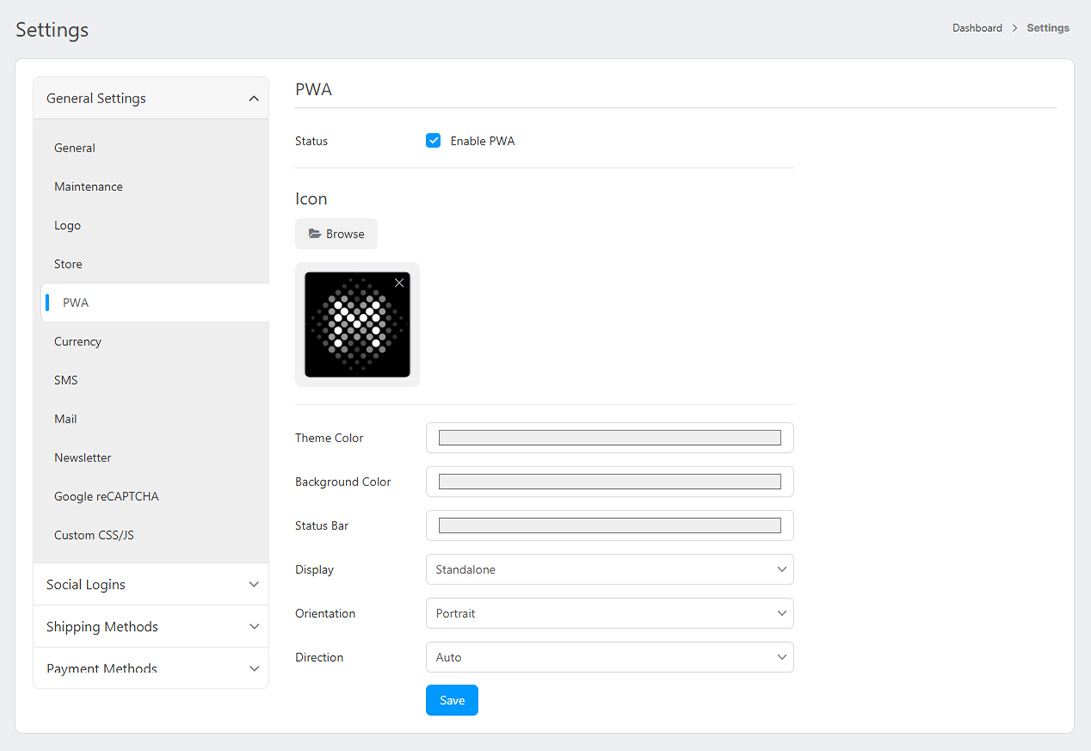 Customize theme color, background color, status bar display, orientation, and text direction (LTR, RTL, AUTO) in the "PWA" section to tailor the Progressive Web App to preferences. Ensure a personalized and smooth user experience.