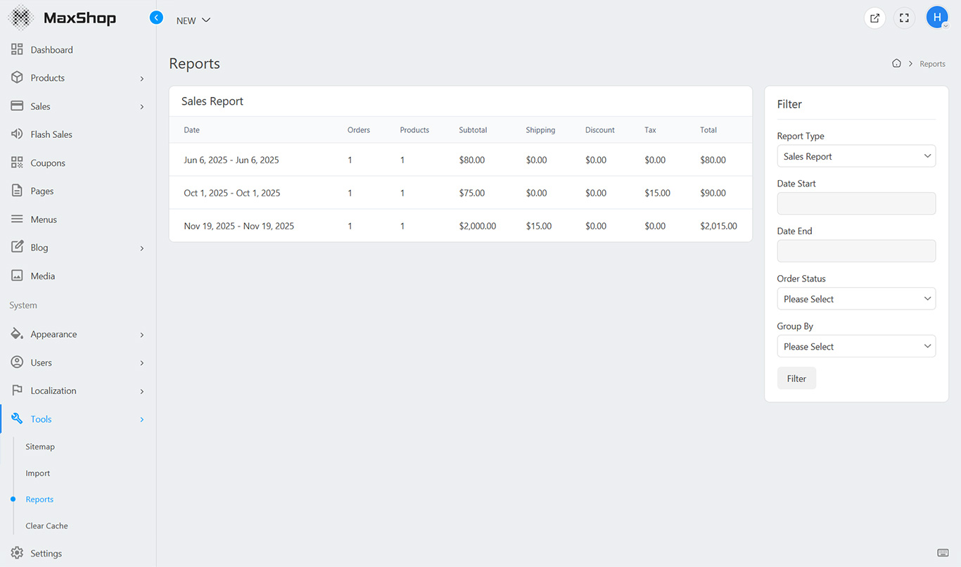 You can view several types of reports of your online store. Choose the report type from filter section to view other reports.