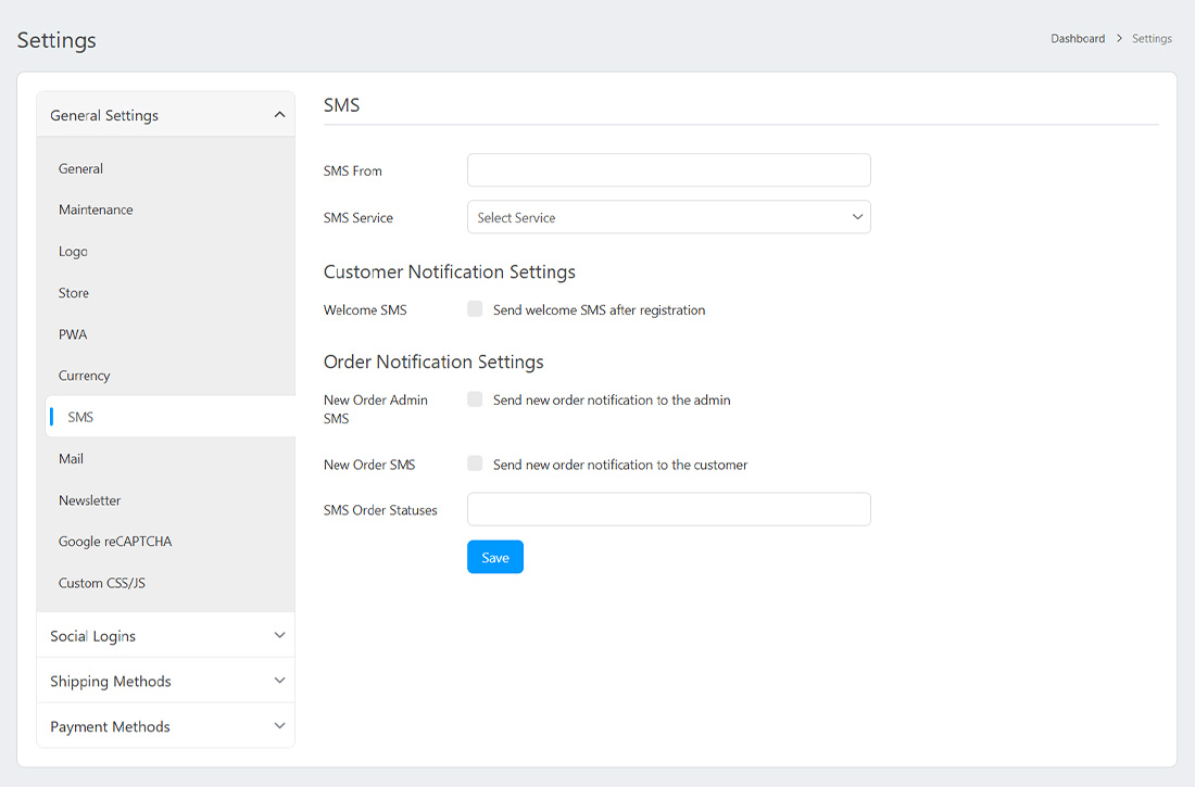 Enable notifications like New Order Admin SMS and New Order SMS to promptly stay updated on incoming orders. Define SMS for various order statuses to provide real-time updates to customers throughout the order process.