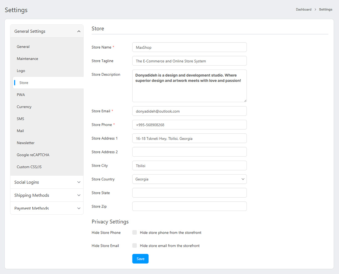 Easily customize store details in one section. Create store name, tagline, email, city, country, and state. Choose to hide phone numbers and emails for privacy. This ensures a professional and tailored storefront for seamless customer interaction.