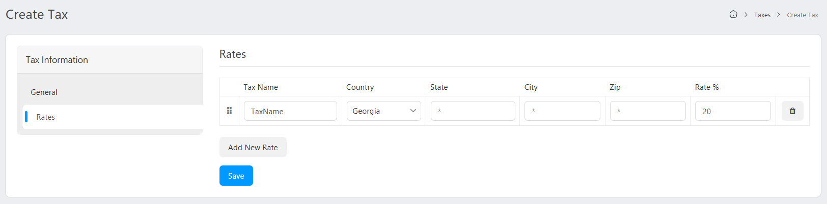- Zip: The zip where this tax will be applied.