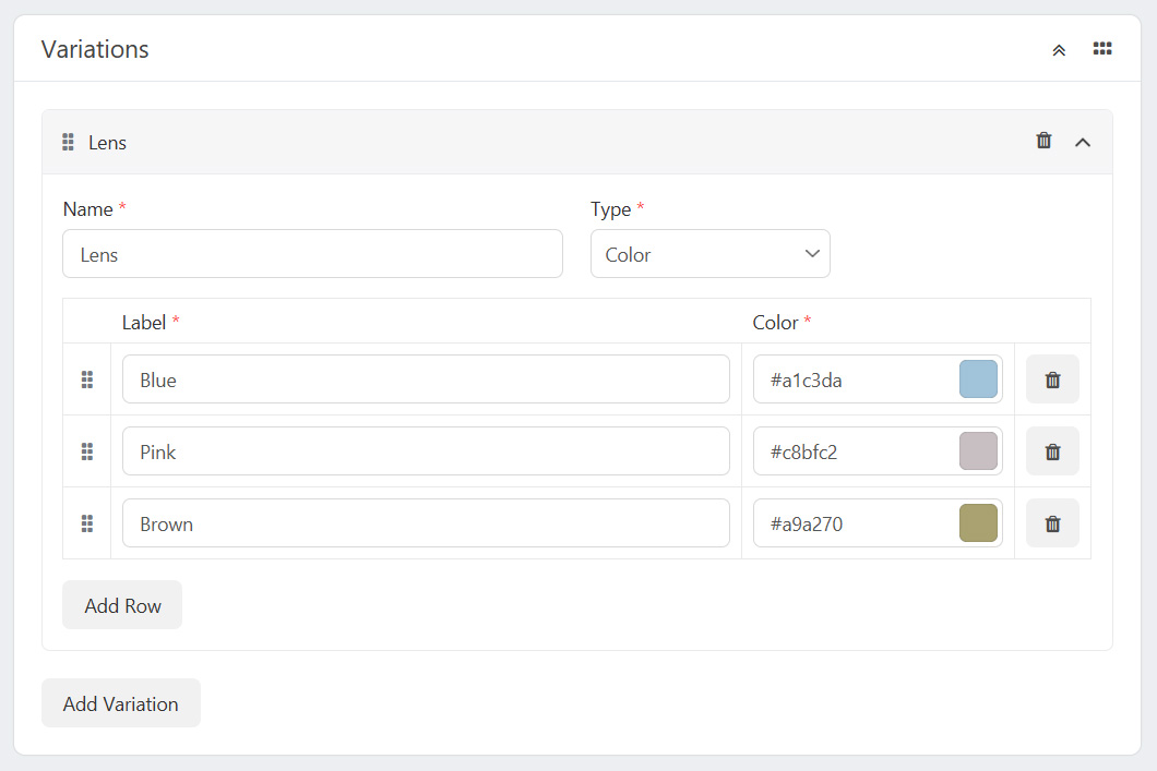 After configuring color and storage options in the Variations section, A set of variant combinations will be generated automatically. Here, all combinations of colors and storage variants are displayed.