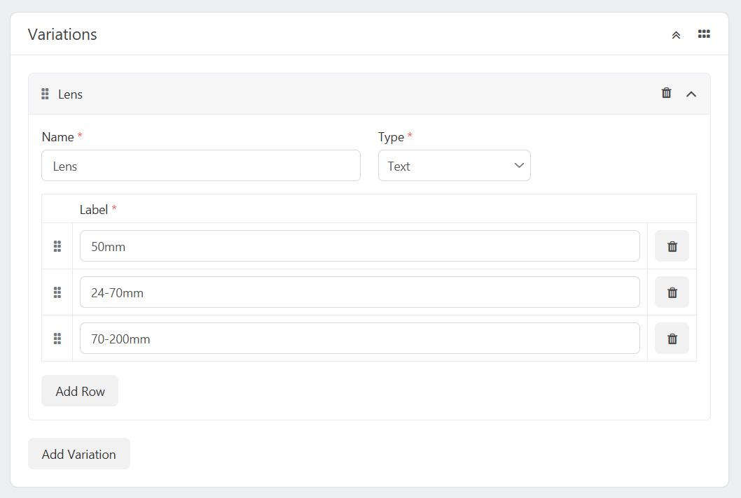 There are three types of variations: Text, Color, and Image.