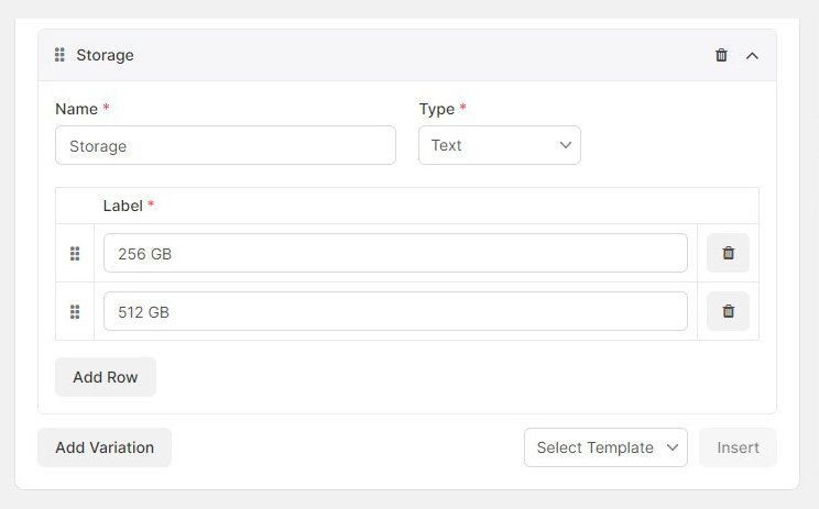 In the Variations section, configure storage options similar to color variations. Set a name such as "Storage", choose the type as "Text", and then enter storage preferences like "256 GB Storage", "512 GB Storage", and so on. This setup allows customers to select their preferred storage configuration from the options provided on the product page before adding the product to their cart.